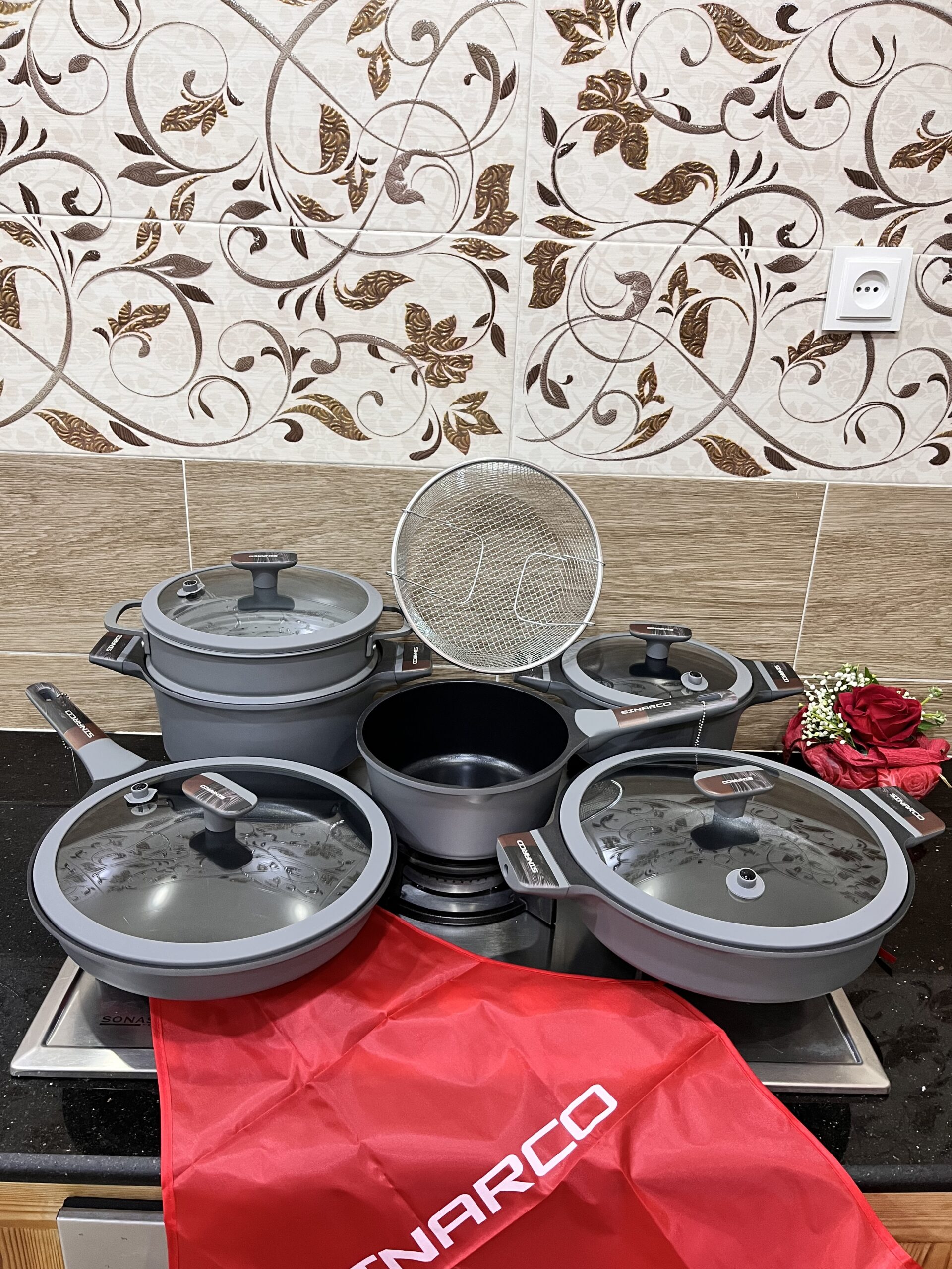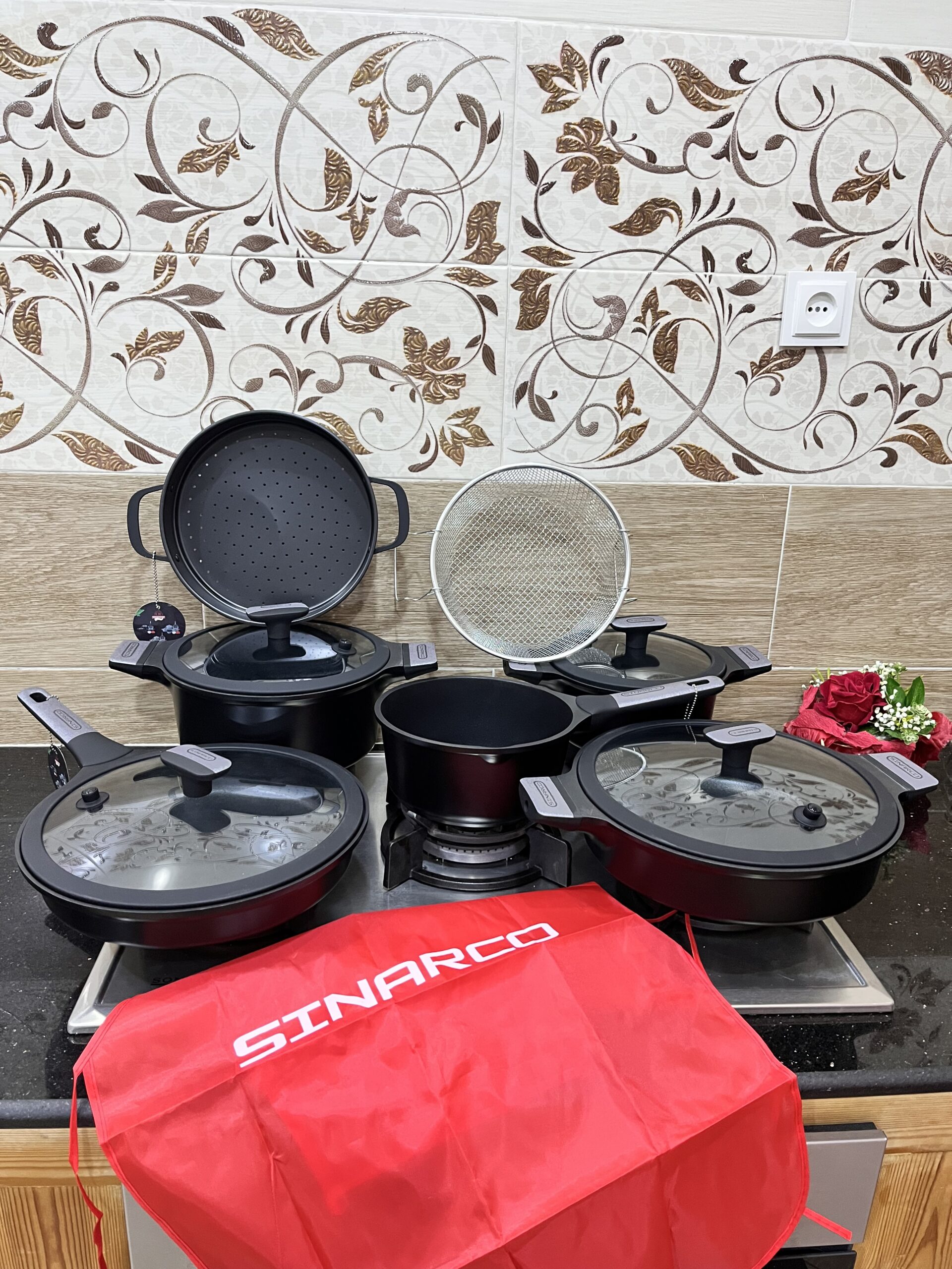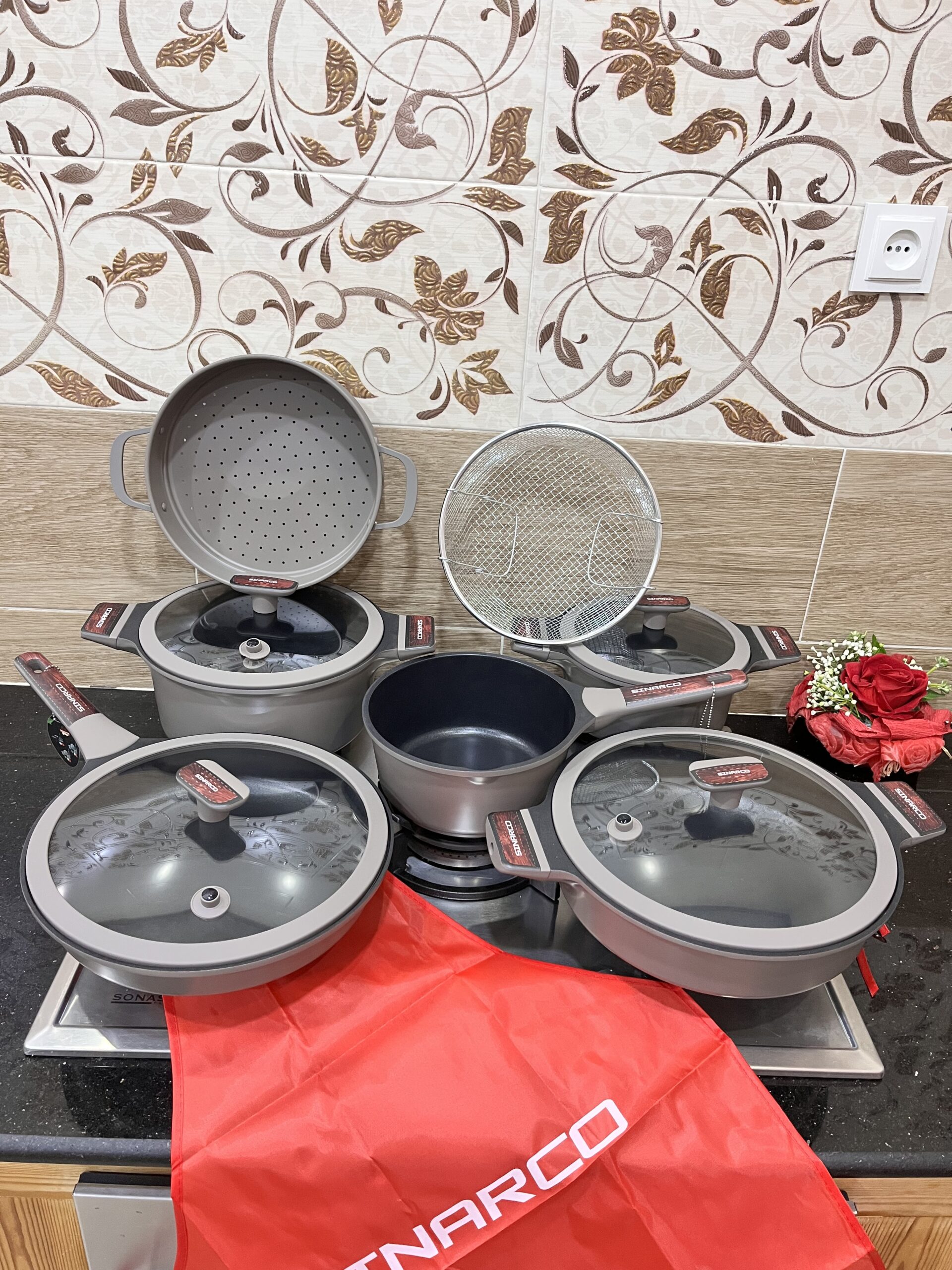 طقم مطبخ راقي بلمسة عصرية راح تزيدلك النص في مطبخك مصنوع من مواد عالية الجودة مقاوم للإلتصاق و الخدوش مقابض مريحة و جميلة توزيع حراري متساوي يخليك طيبي براحة تامة